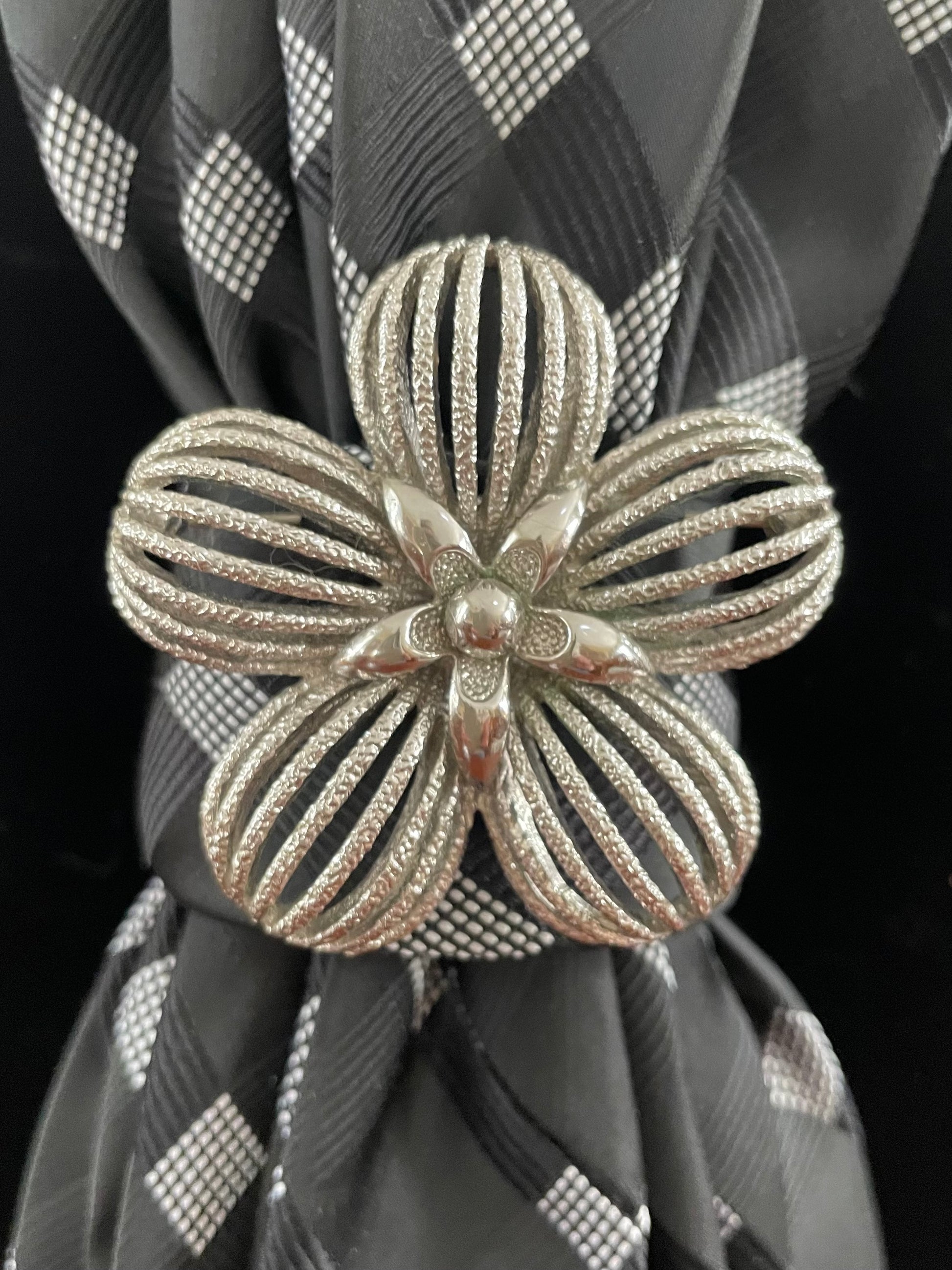 Don your best white blouse or LBD with this classic beauty! This up-cycled Bergamo New York tie in classic black with silver + grey patterns wraps a gorgeous, chunky silver and black necklace, and is pinned off by a Monet-stamped silver classic floral brooch for a timeless look turned fresh.