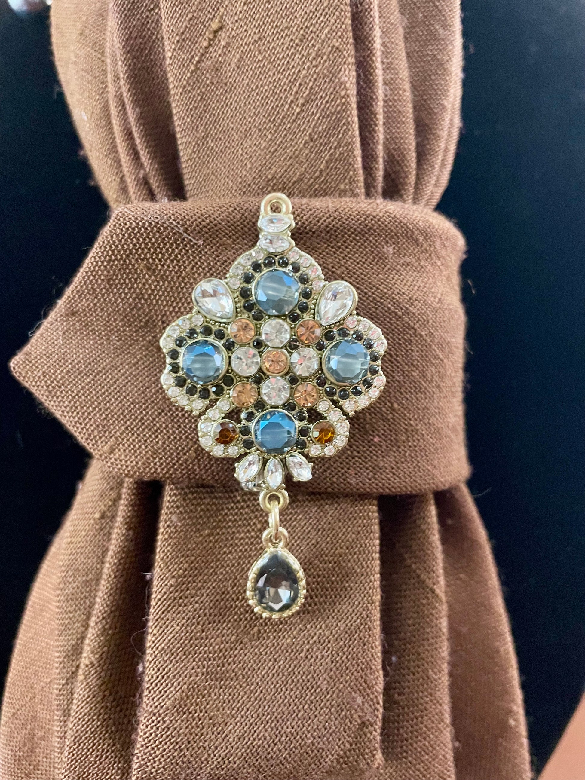 This solid mocha brown vintage Marquis necktie may have seen its day, but its best years are ahead! Repurposed as a necktie necklace, this tie is pinned with a grey and brown sparkly brooch and hangs from a vintage grey and black glass beaded necklace with silver metal links and intermittent pearls for the perfect up-cycle vibe!