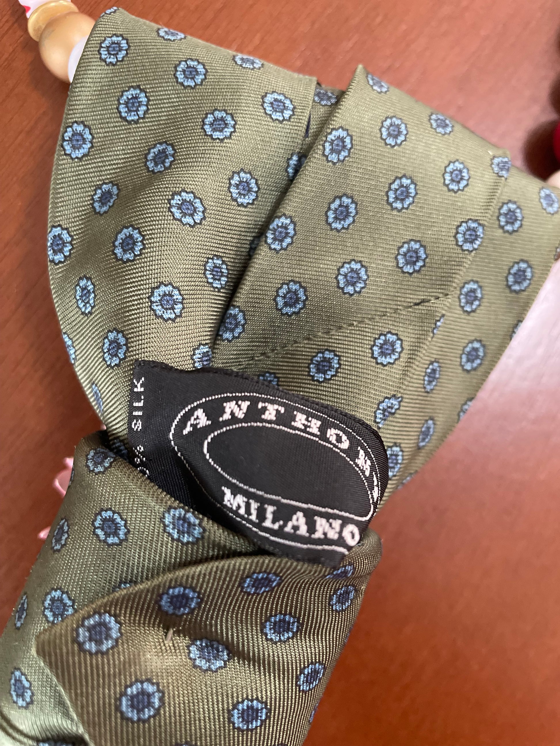 This darling vintage, candy-cane stripes, wood beaded necklace adorns an Italian silk necktie wrapped up in a playful red poinsettia for all the Holiday cheer!