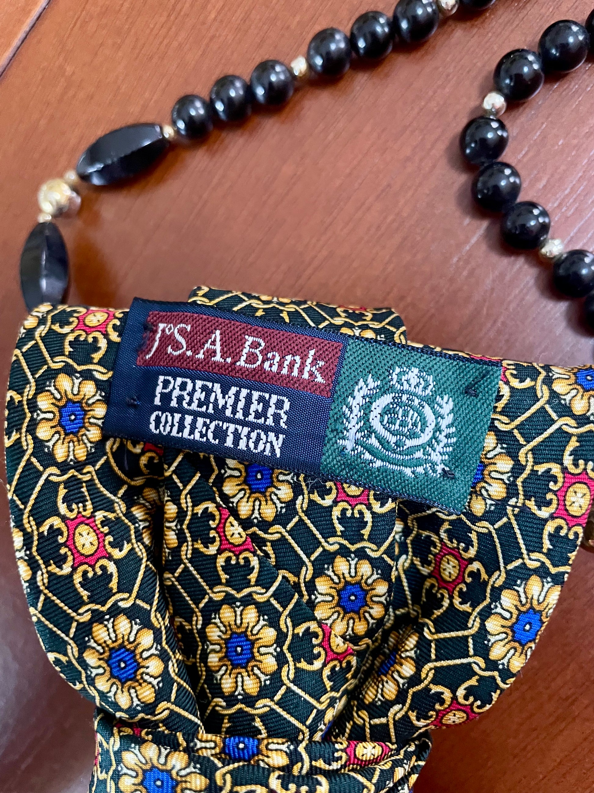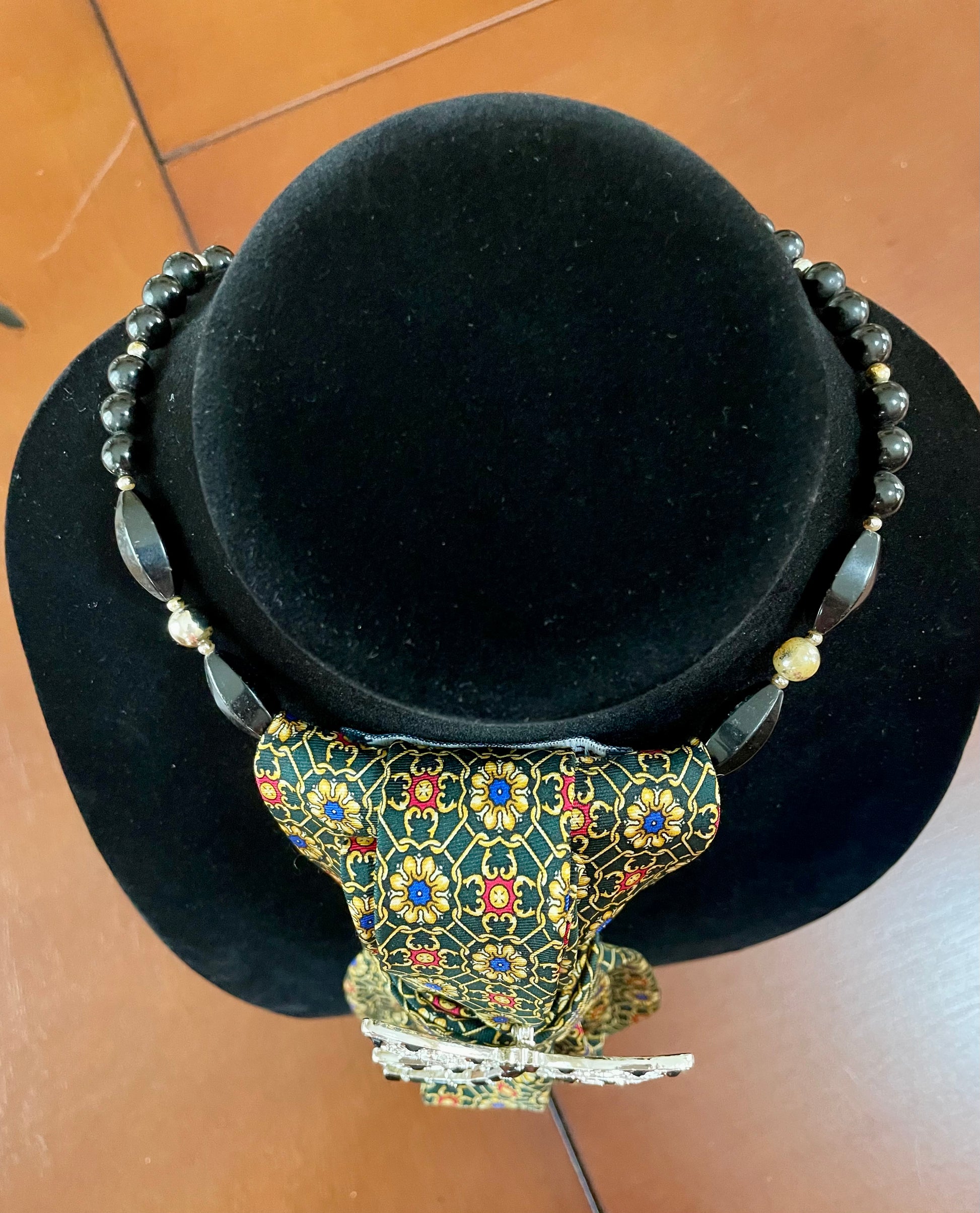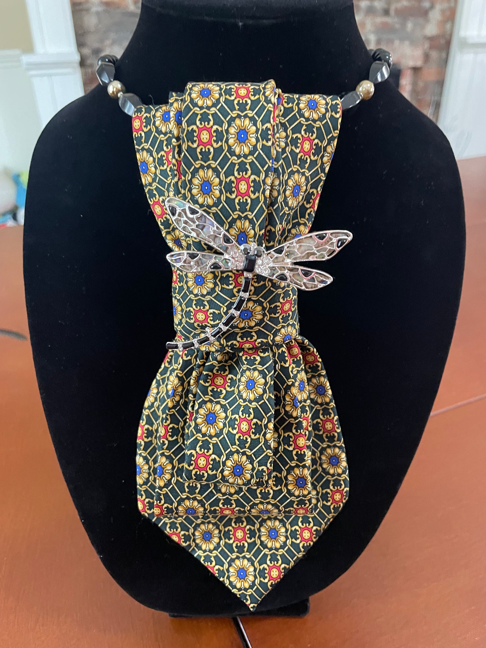 A reminder of life’s beauty and the ability to embrace change, a dragonfly is the highlight of this already crazy busy printed necktie necklace!✨The strong yellows, greens, reds, and blues of this geometric tie allow the silver and black to pop.💎 The sparkly stones add magic and completely transform this tie and vintage beaded necklace!