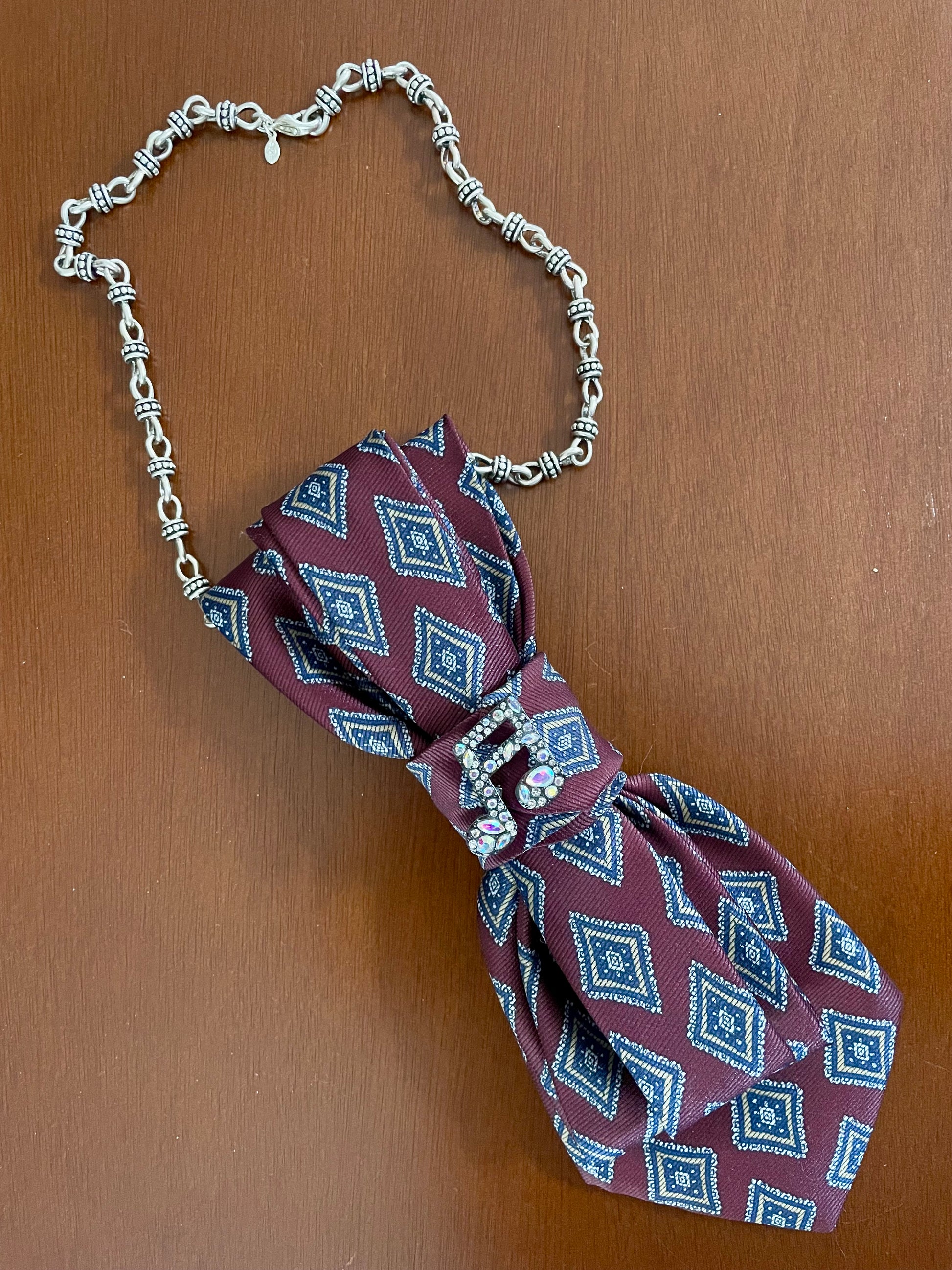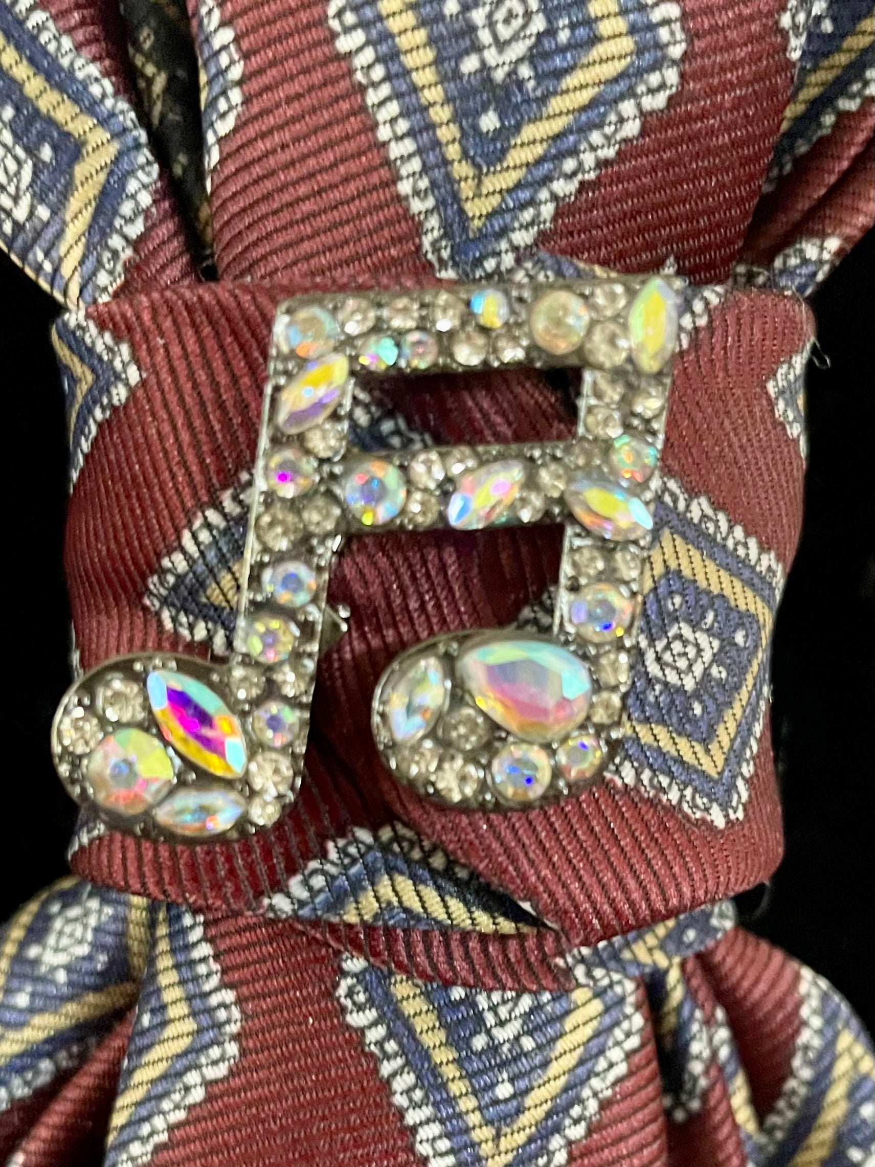 Weighty Premier Designs sterling silver chain necklace hangs a classic retro necktie in blood red with grey diamonds, pinned with a black and silver glass beaded music note brooch. Rock on!!