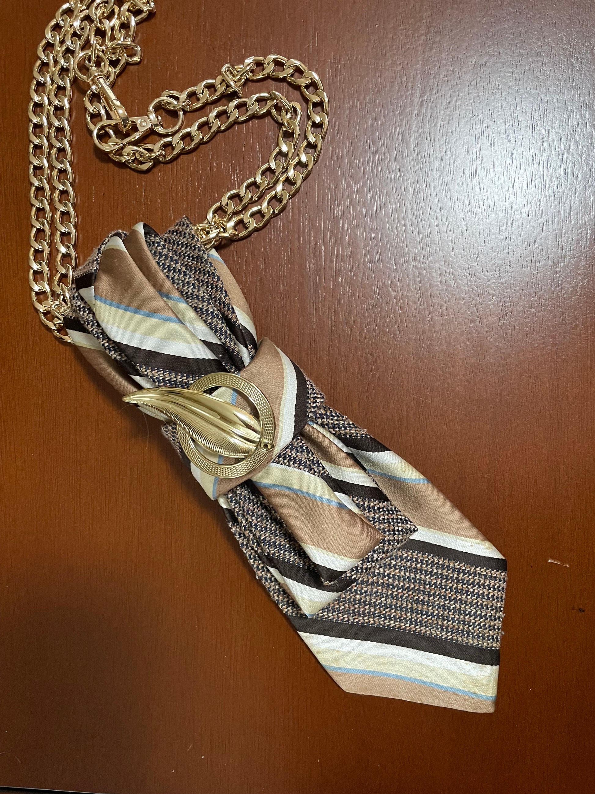 Late Night has never been better! Like classic talkshow host, Johnny Carson, you will be the star of the show in this time-stopping vintage patterned necktie necklace!! Complete with a super cool vintage brooch and double gold chain, this statement necklace says everything “cool” can say — no words.