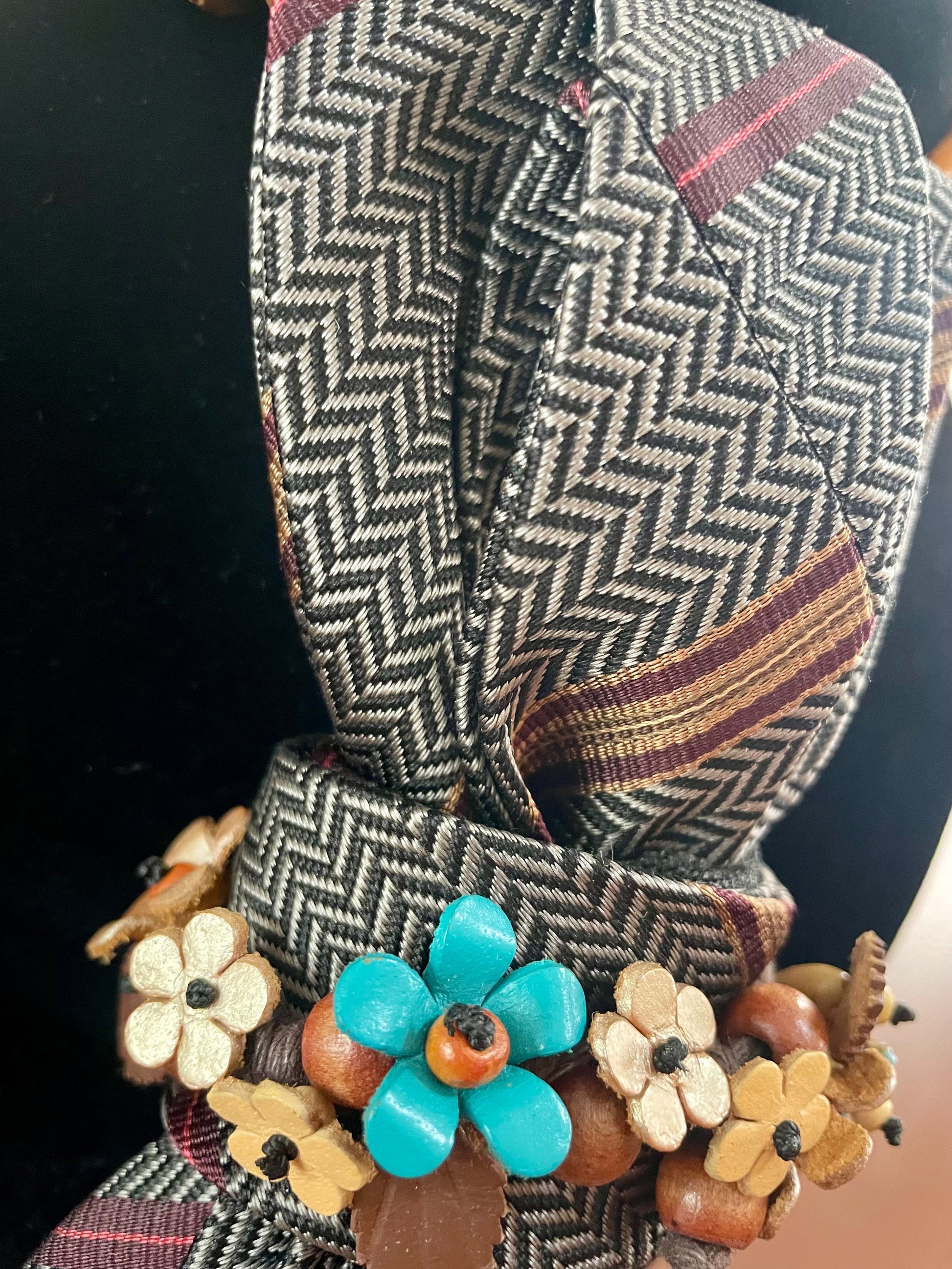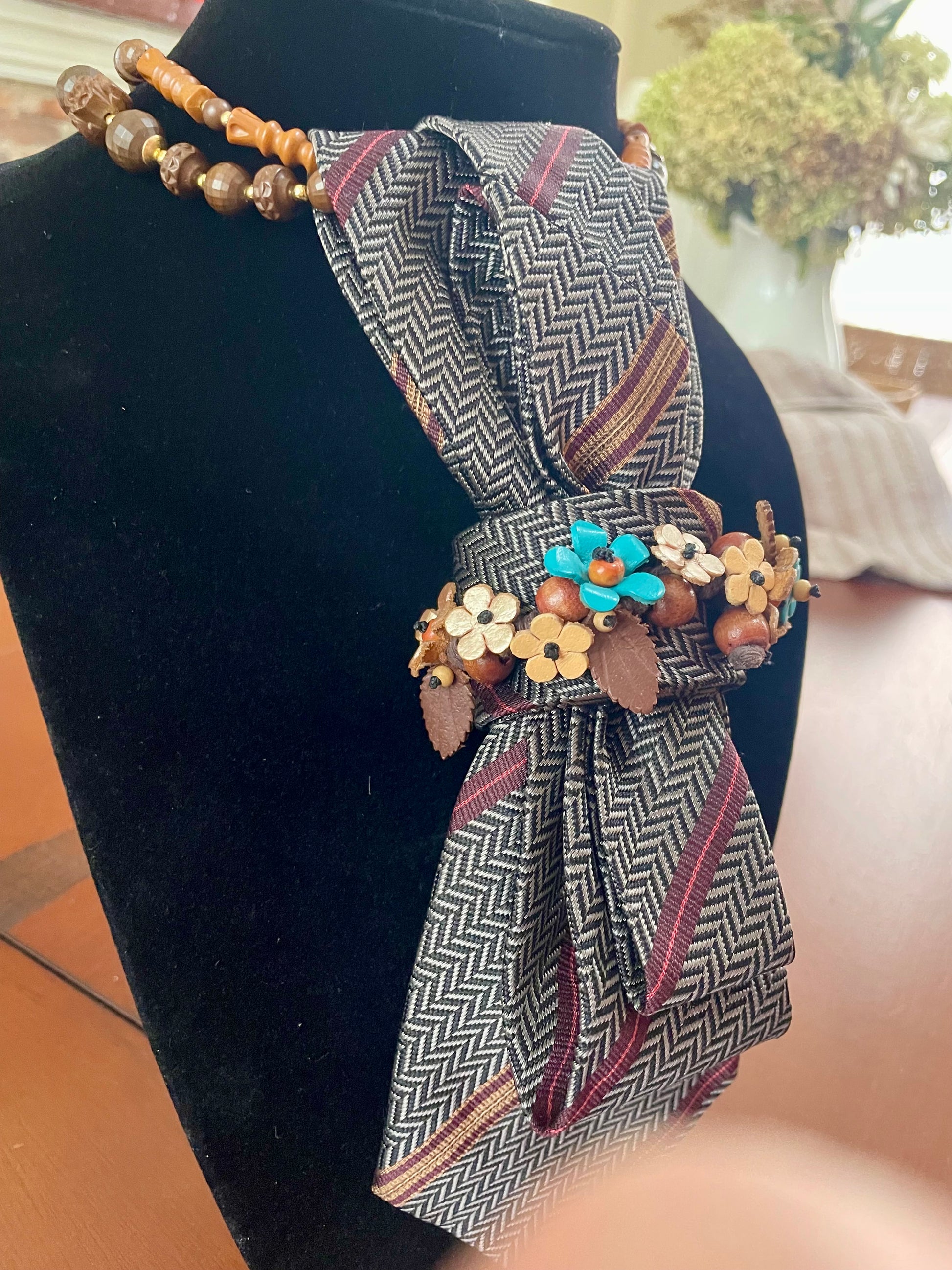 What does mixing leather flowers, a classic vintage necktie, and a brown wood-inspired vintage necklace create? A Natural Vintage Hippie! This casual statement necklace will subtly add style to any outfit this Fall or Winter, for sure!✌️