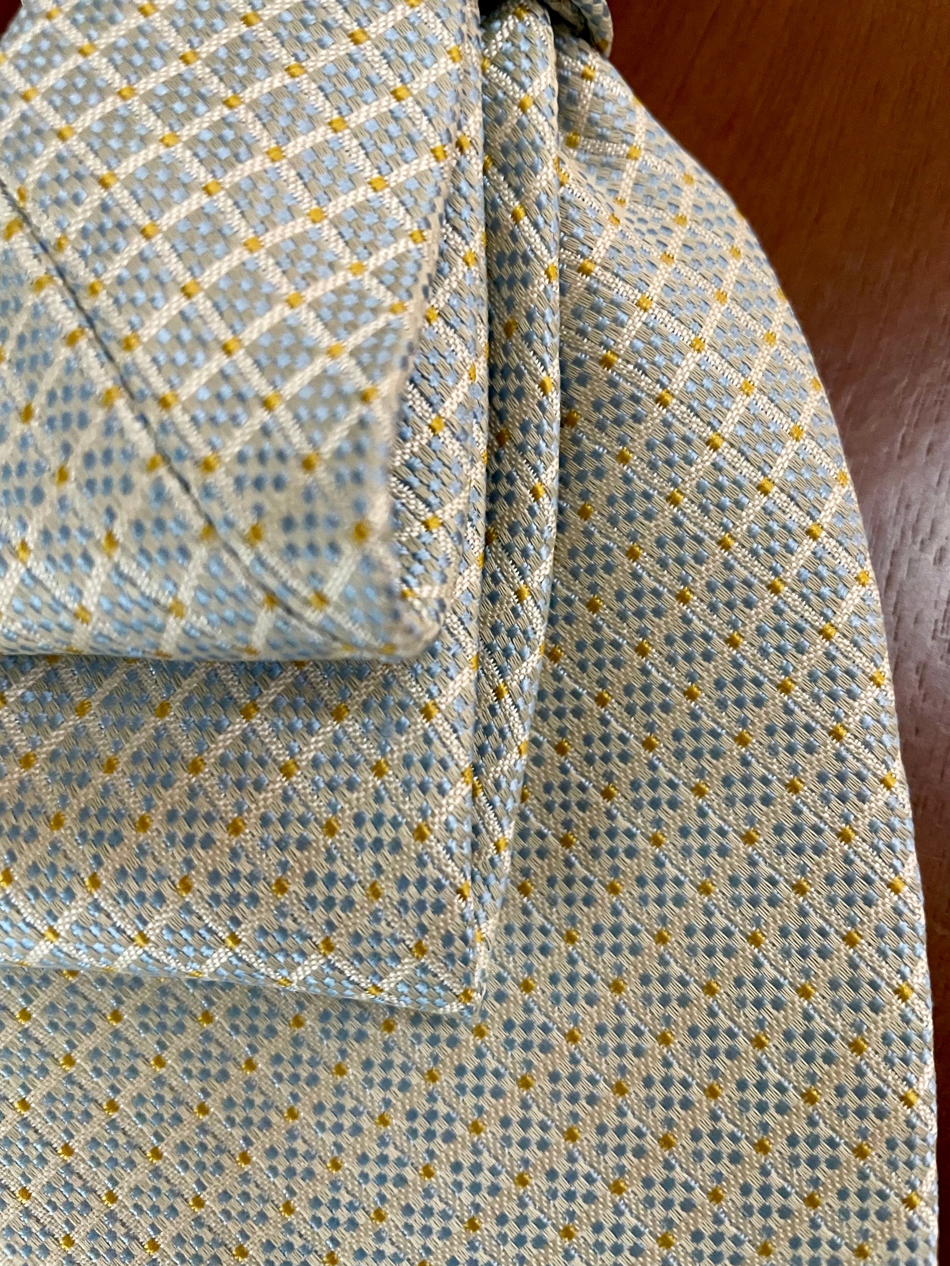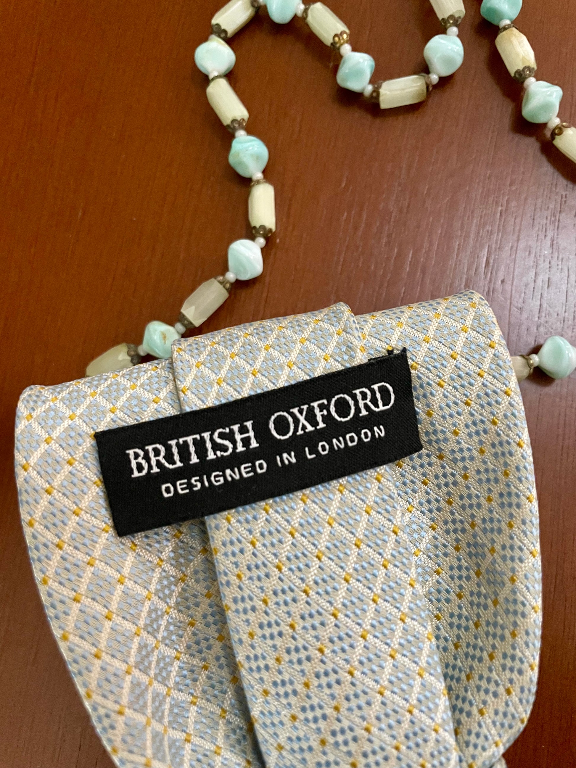 Let this sparkly colorful Christmas tree shine when you elevate your look with this clean, soft patterned British Oxford-designed tie, dangling from a vintage cream, white, and aqua blue beaded necklace. The perfect compliment to a soft cashmere sweater or let it pop from under a collared blouse or blazer! Shine on…