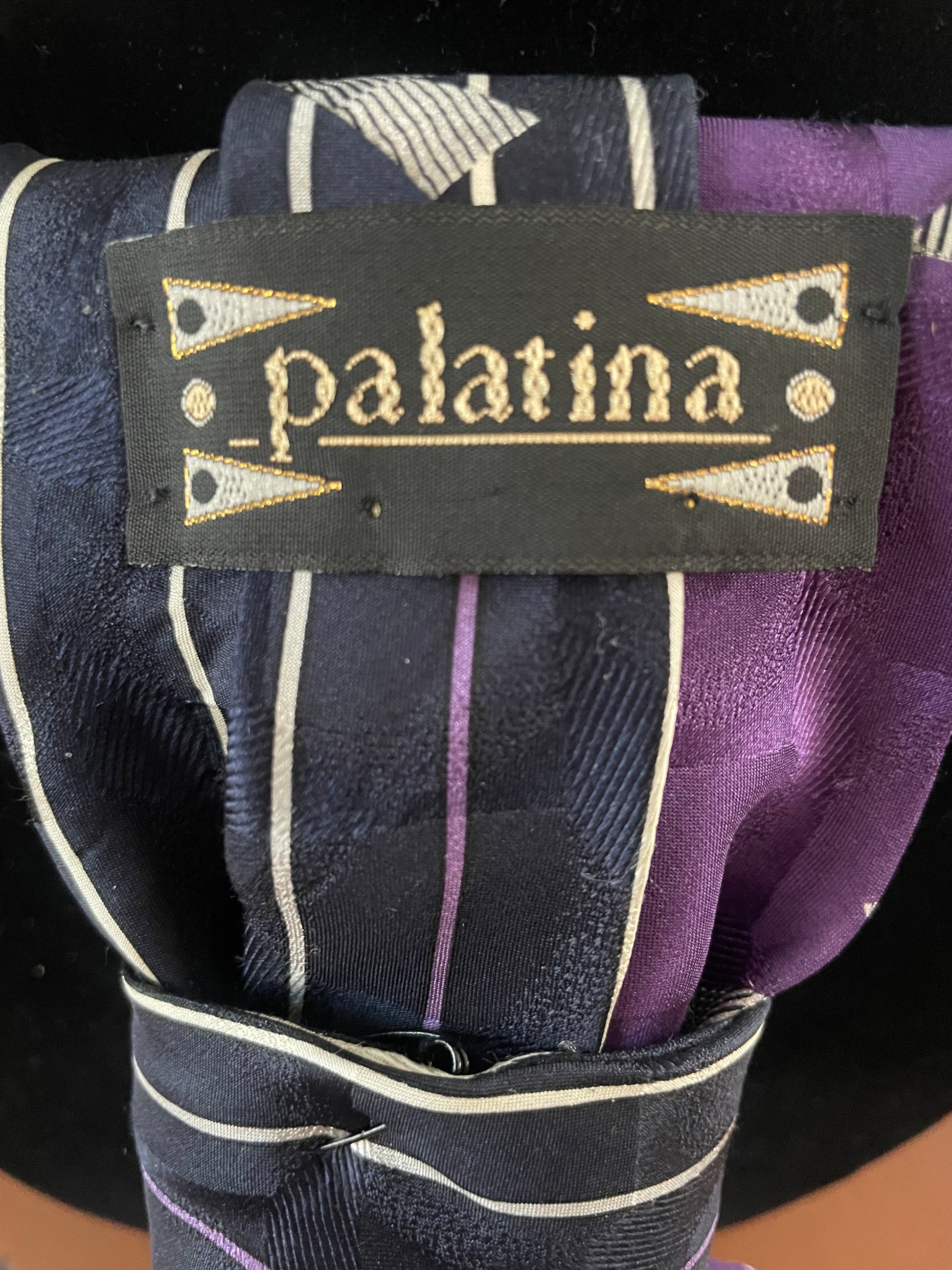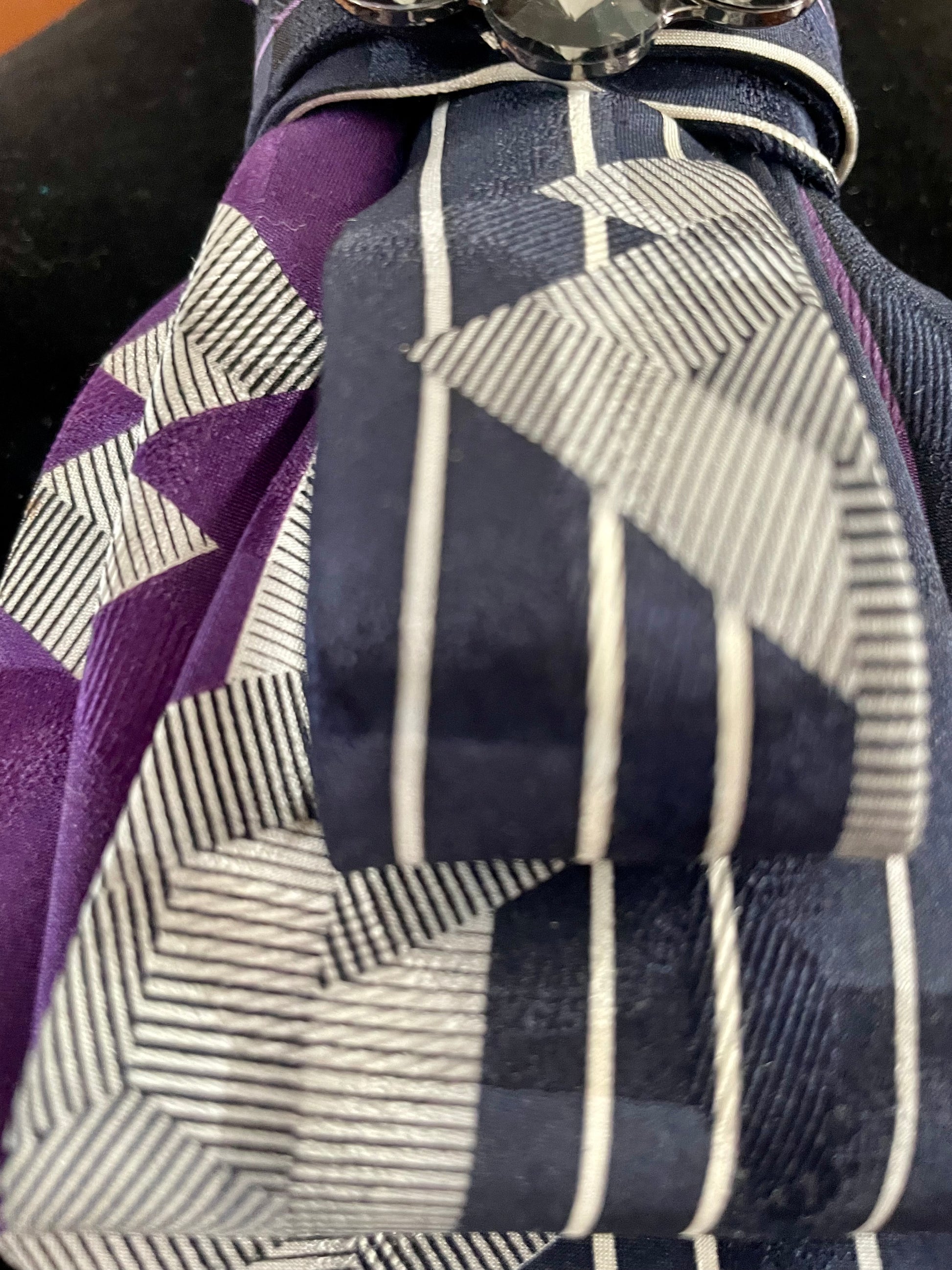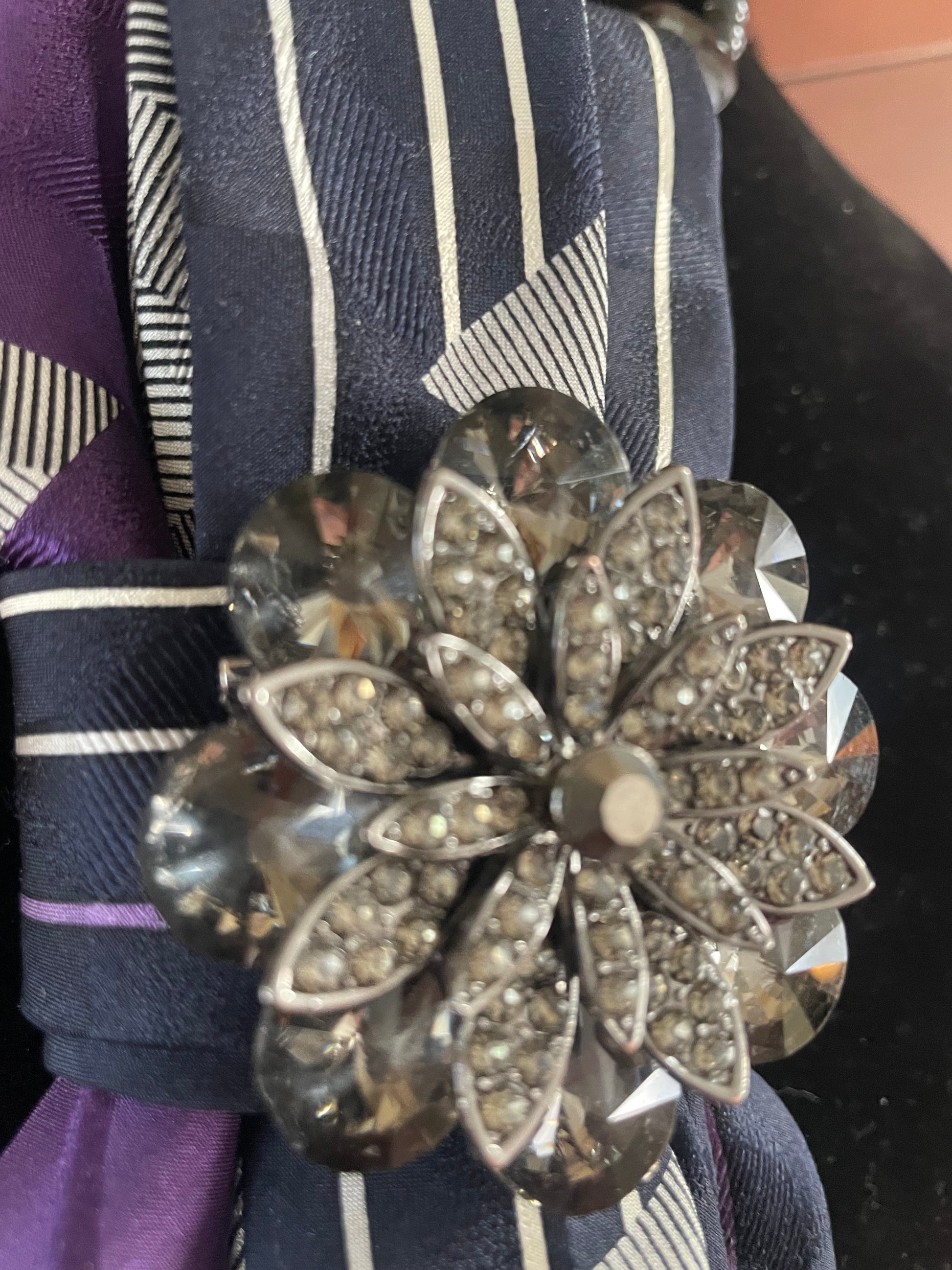 This purple, black, and silvery white Palatina 100% silk necktie has been beautifully upcycled to include shiny black geometric beads and a gorgeous sparkly grey, black, and silver brooch to instantly jazz up any basic black, white, or grey top! A must-have!