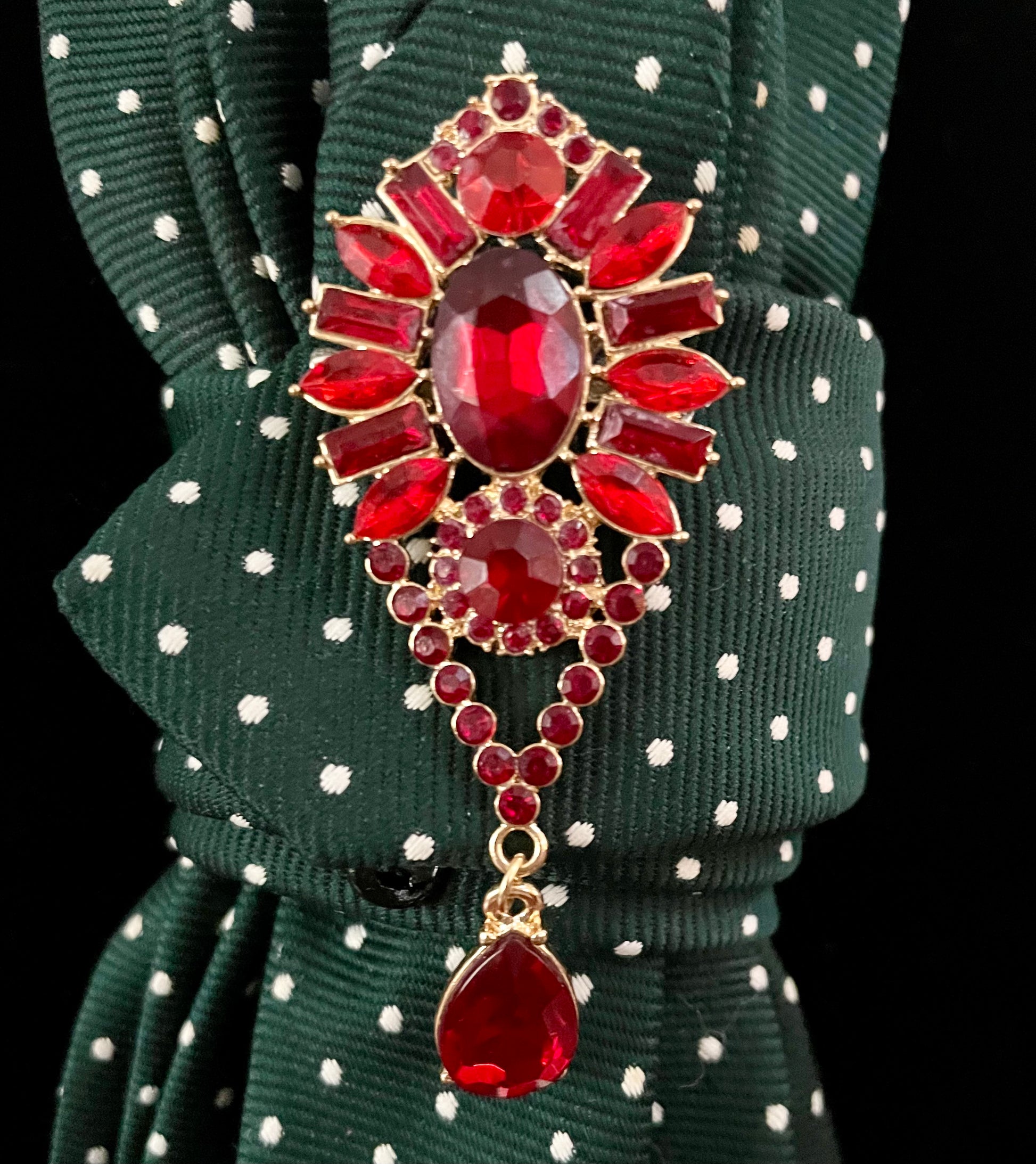 This necktie’s combination of classic green, red, and white reflects a charming, traditional Christmas, complete with white dots like falling snow! The vintage Beau Brummel necktie was probably worn on Christmas Day or to the “Work Party” of years past. This upcycled necktie necklace is jazzed up with a glitzy ruby red brooch outlined in gold and just waiting to be hung by the chimney with care.