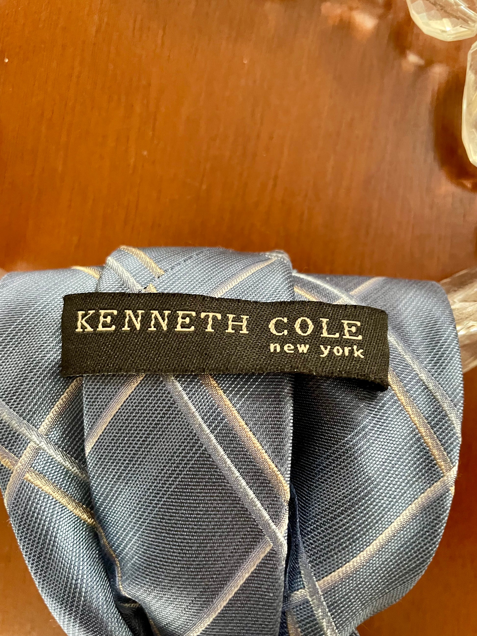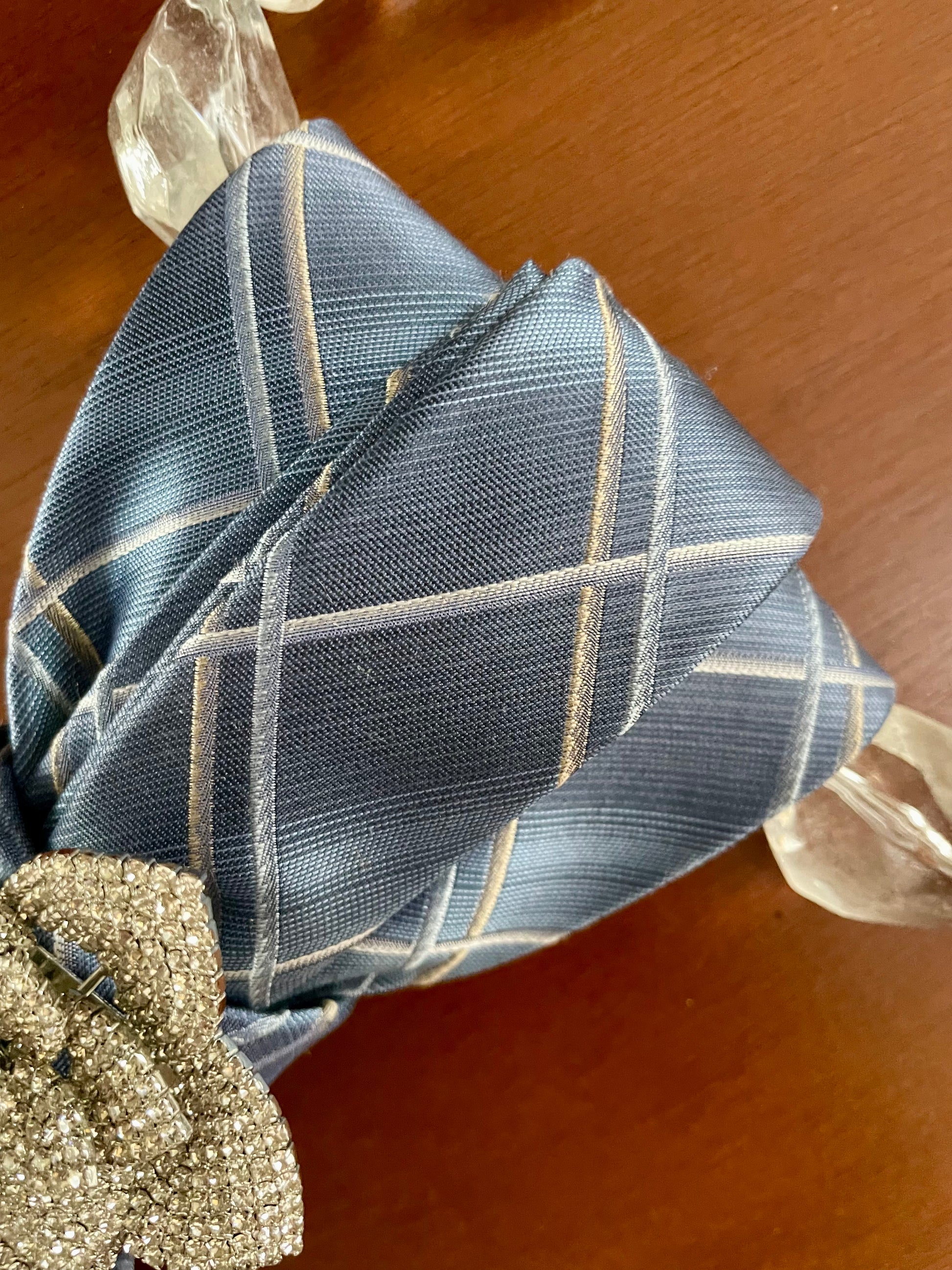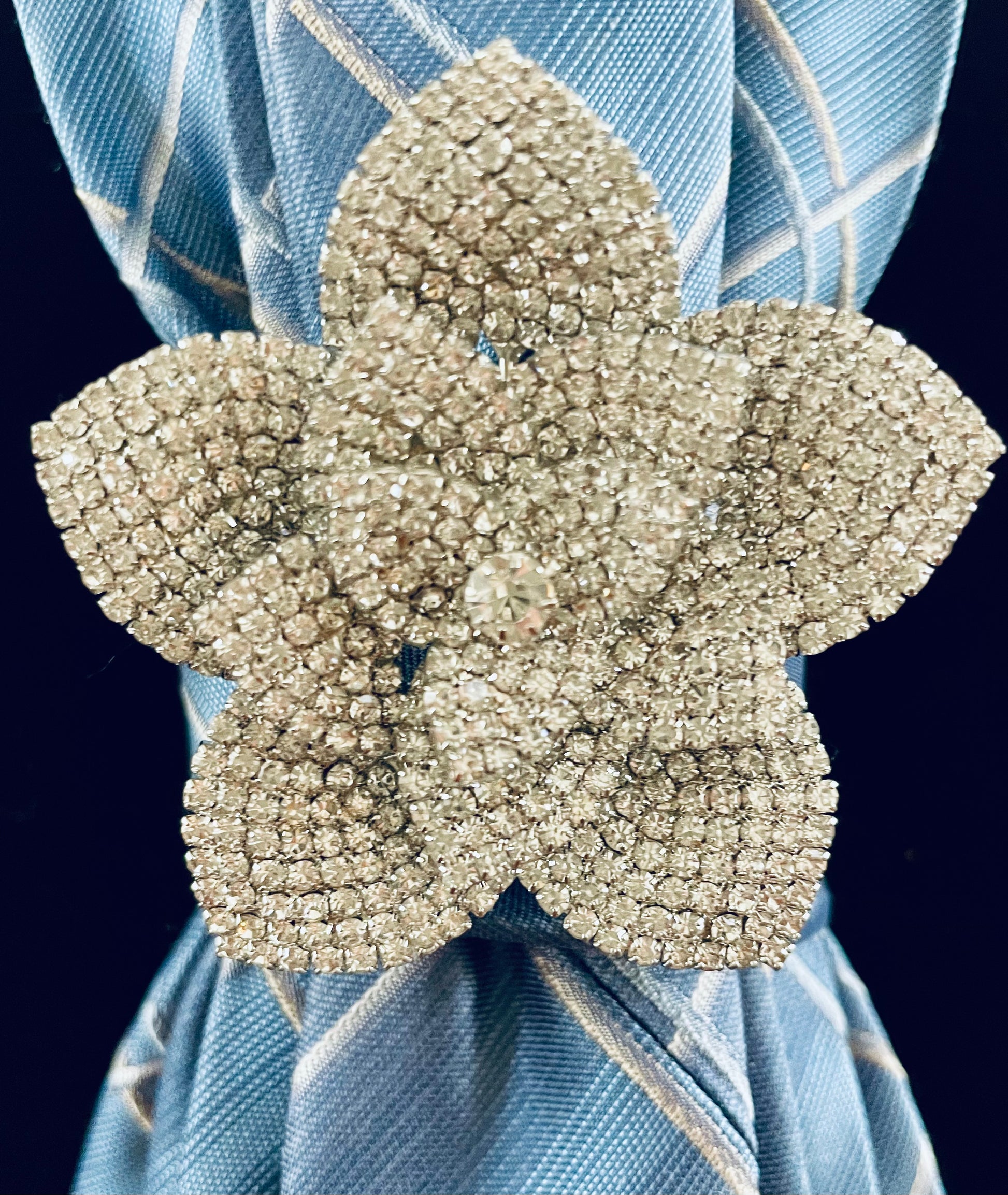 Wrapped in a silvery blue Kenneth Cole necktie and adorned with a sparkly poinsettia-shaped flower, this necktie necklace elevates fashion for full glam at your upcoming Holiday party!