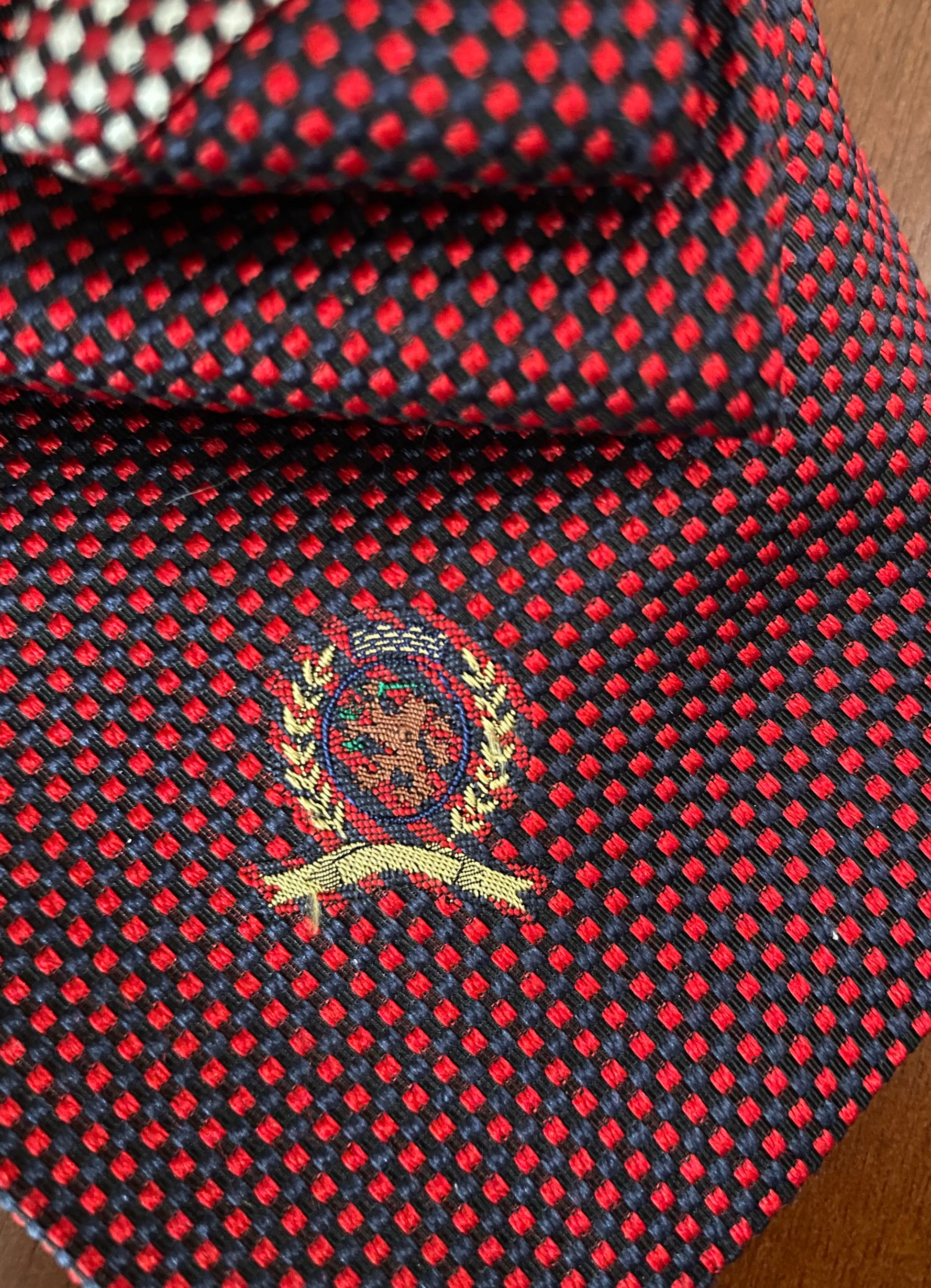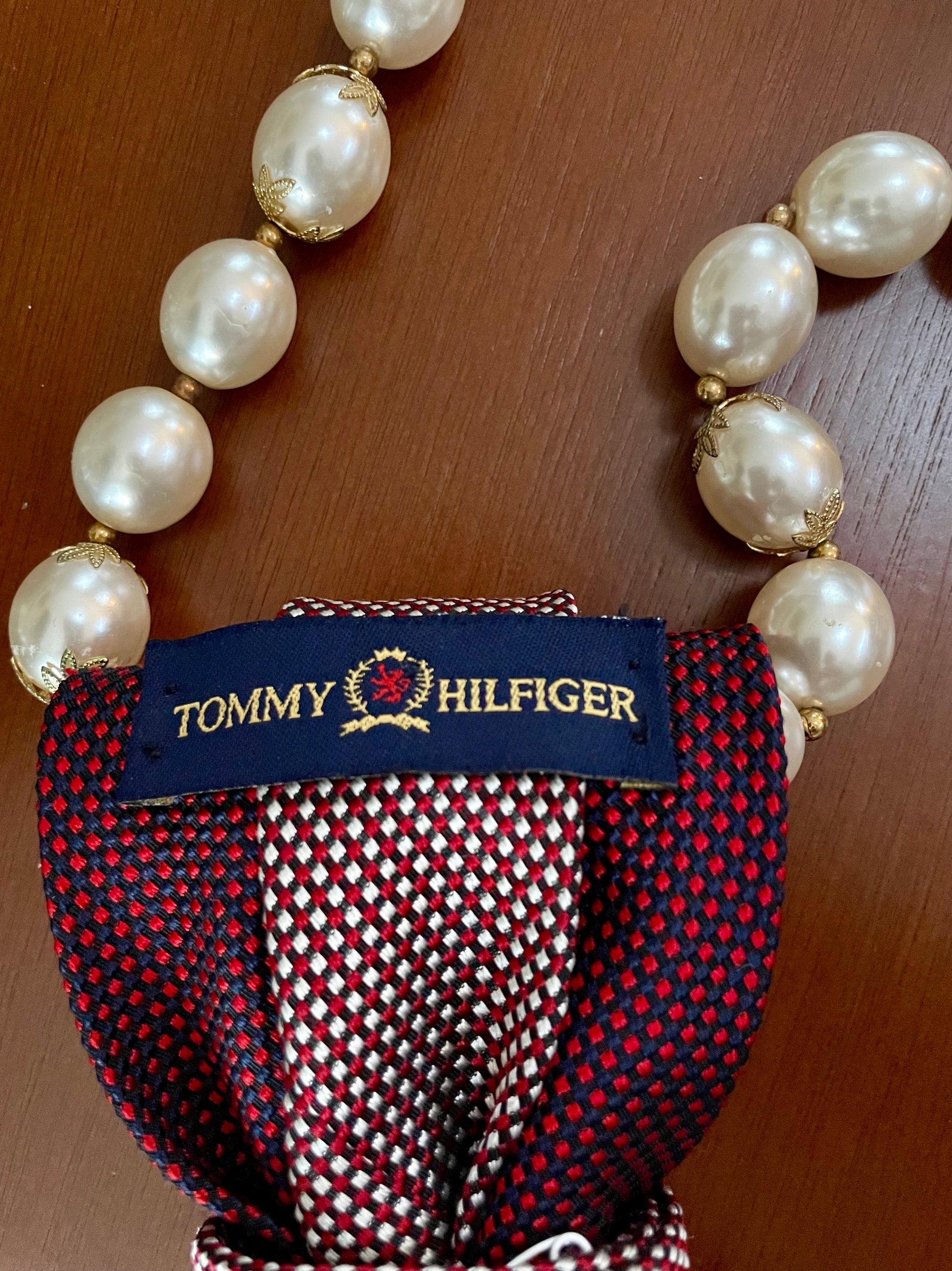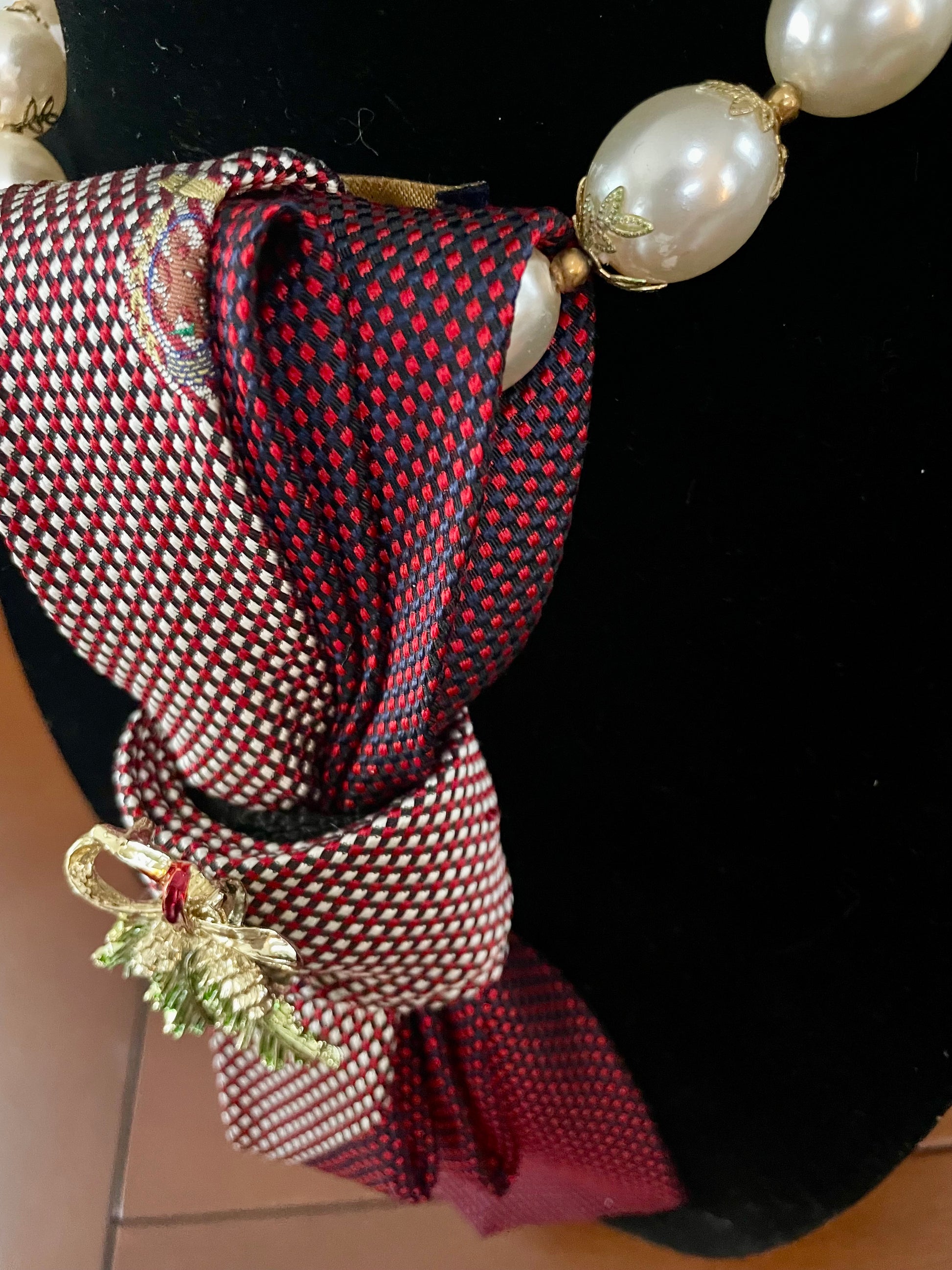 OMG! This vintage mistletoe brooch eludes glad tidings of joy! A classic Tommy Hilfiger necktie wraps a gorgeous vintage, oversized, pearl beaded necklace with touches of gold for the perfect classy finish! Fa-la-la-la-ooh-la-la!!