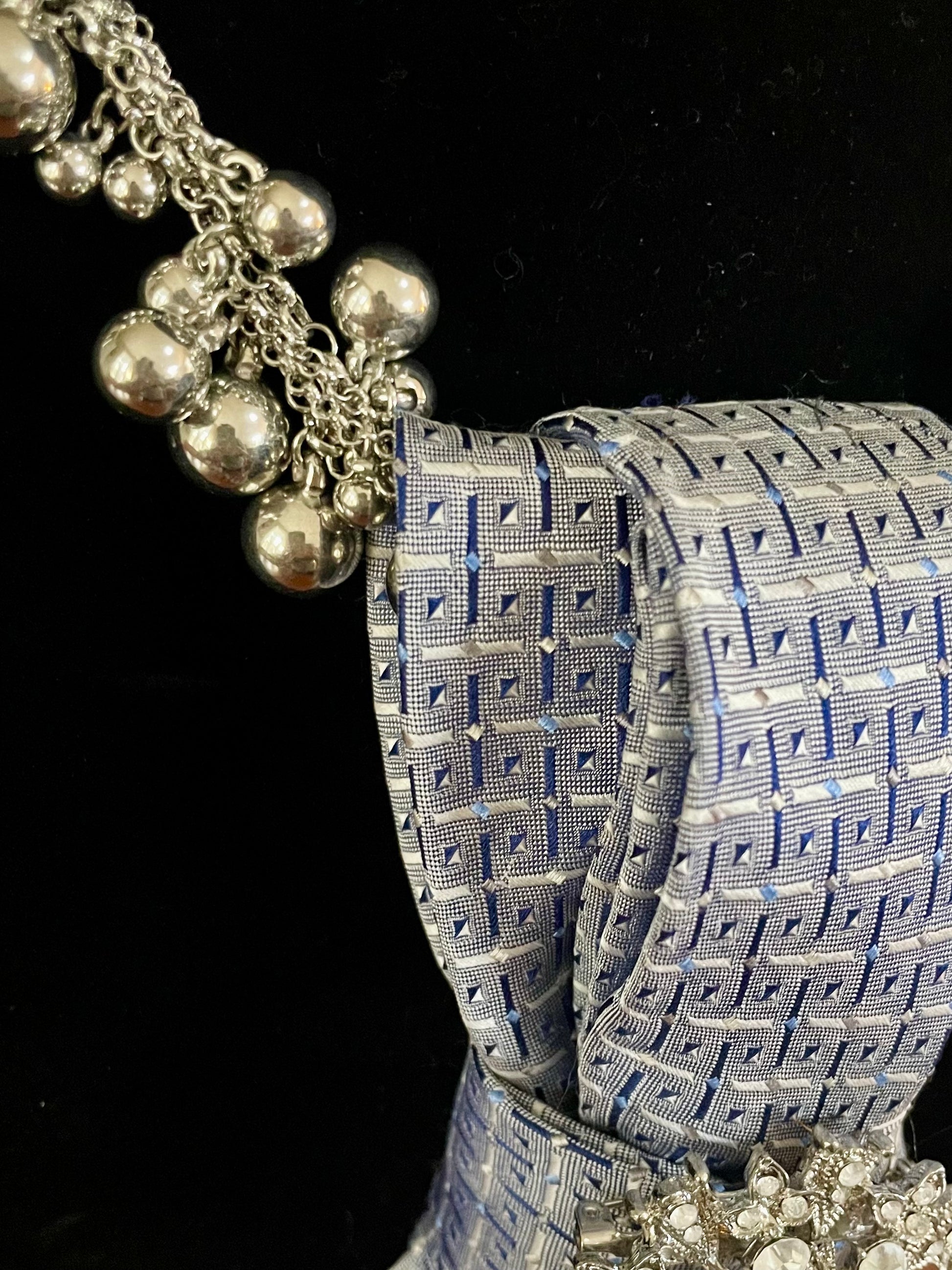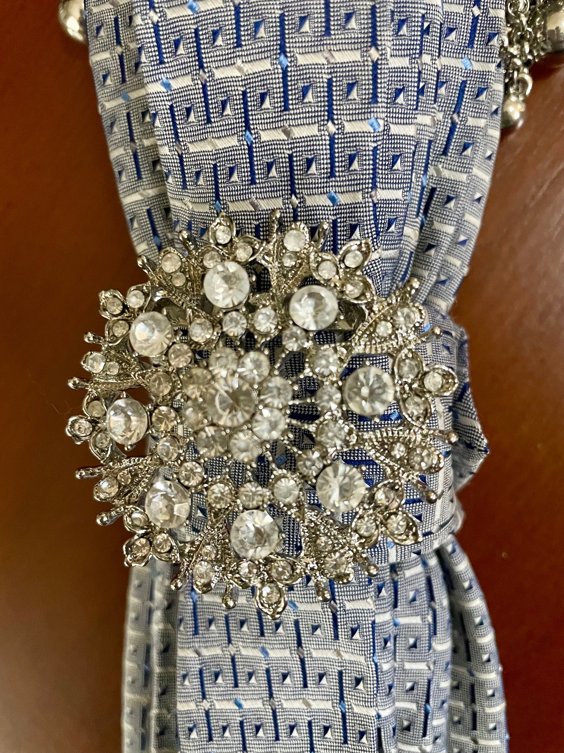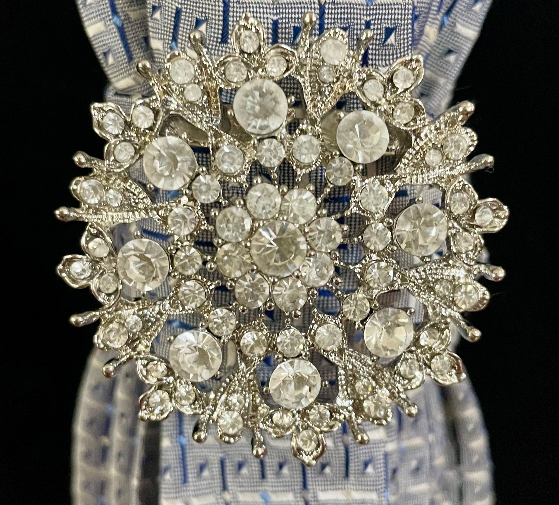Crystal blues and whites combine with these darling silver balls and oversized sparkly snowflake for the perfect winter glam accessory! This handmade, one-of-a-kind gem is the quickest way to elevate your style this winter. A Truly festive find!