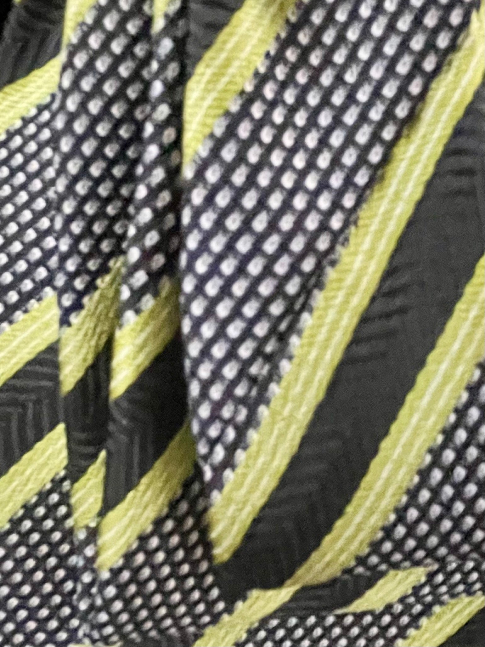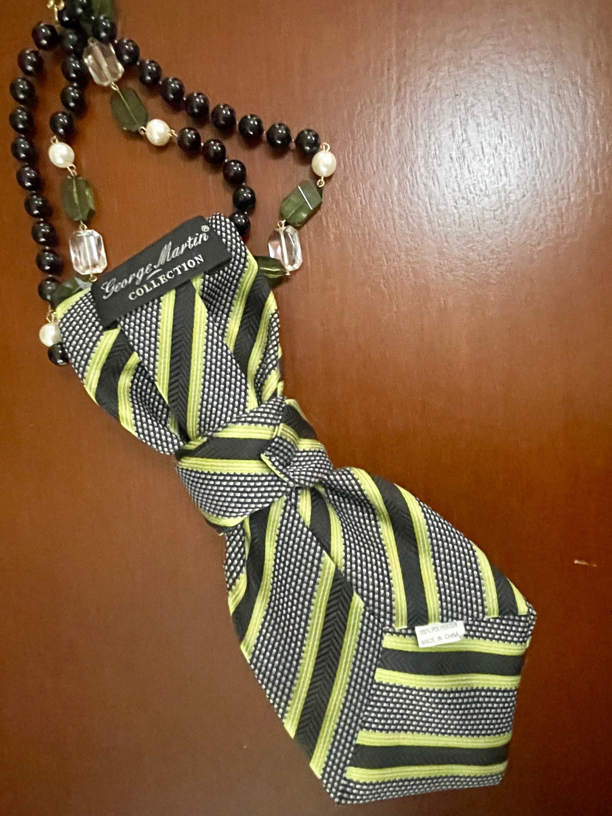 💚If this modern, bejeweled hummingbird brooch doesn’t catch the eye, the striped neon green, black and white necktie will!